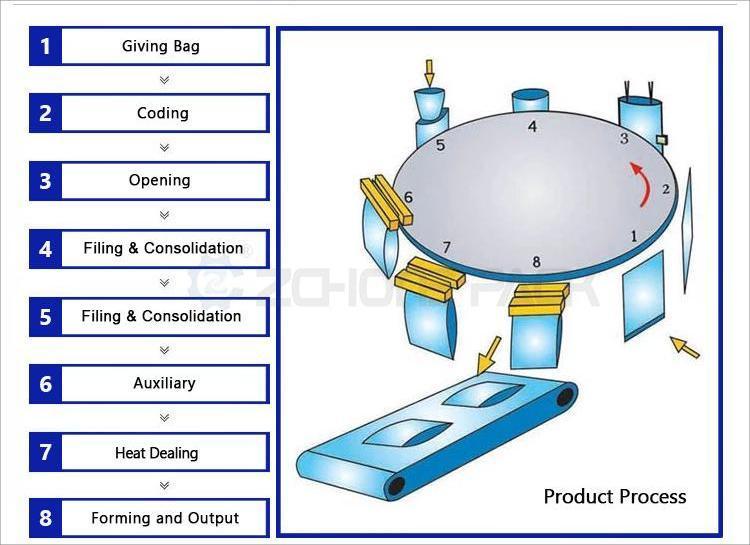 A complete packaging cycle is typically completed sequentially at eight stations, each performing a specific action, producing a bag of finished product after one rotation.